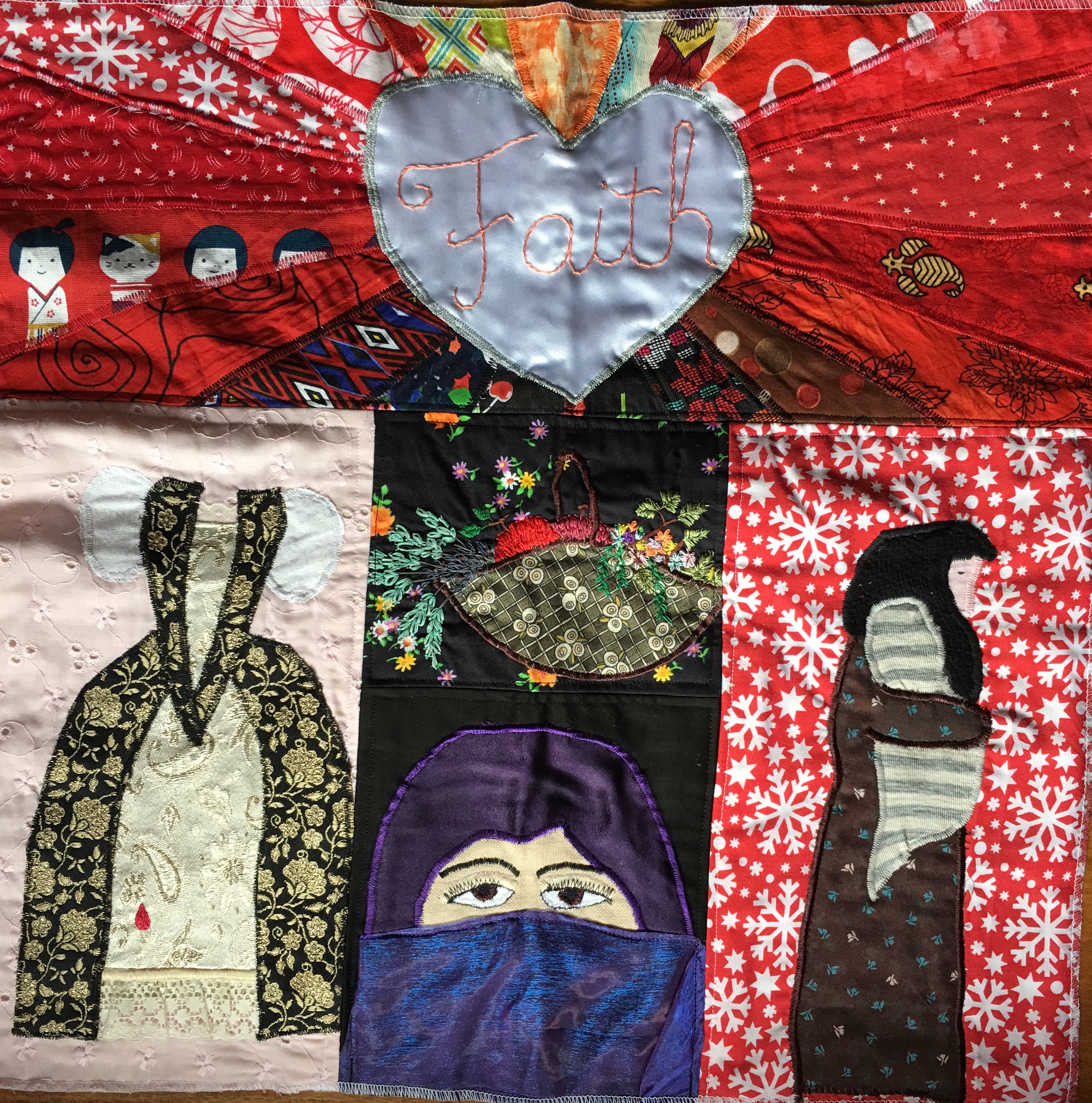 This is the work that has come from the last month working with my Soulful Sewing Circle. It is the completed patched square representing five of my past lives. I’ve been taught many things about how my body reacts in different situations, why I’ve experienced physical and emotional pain this lifetime and recognised where my strengths are.
